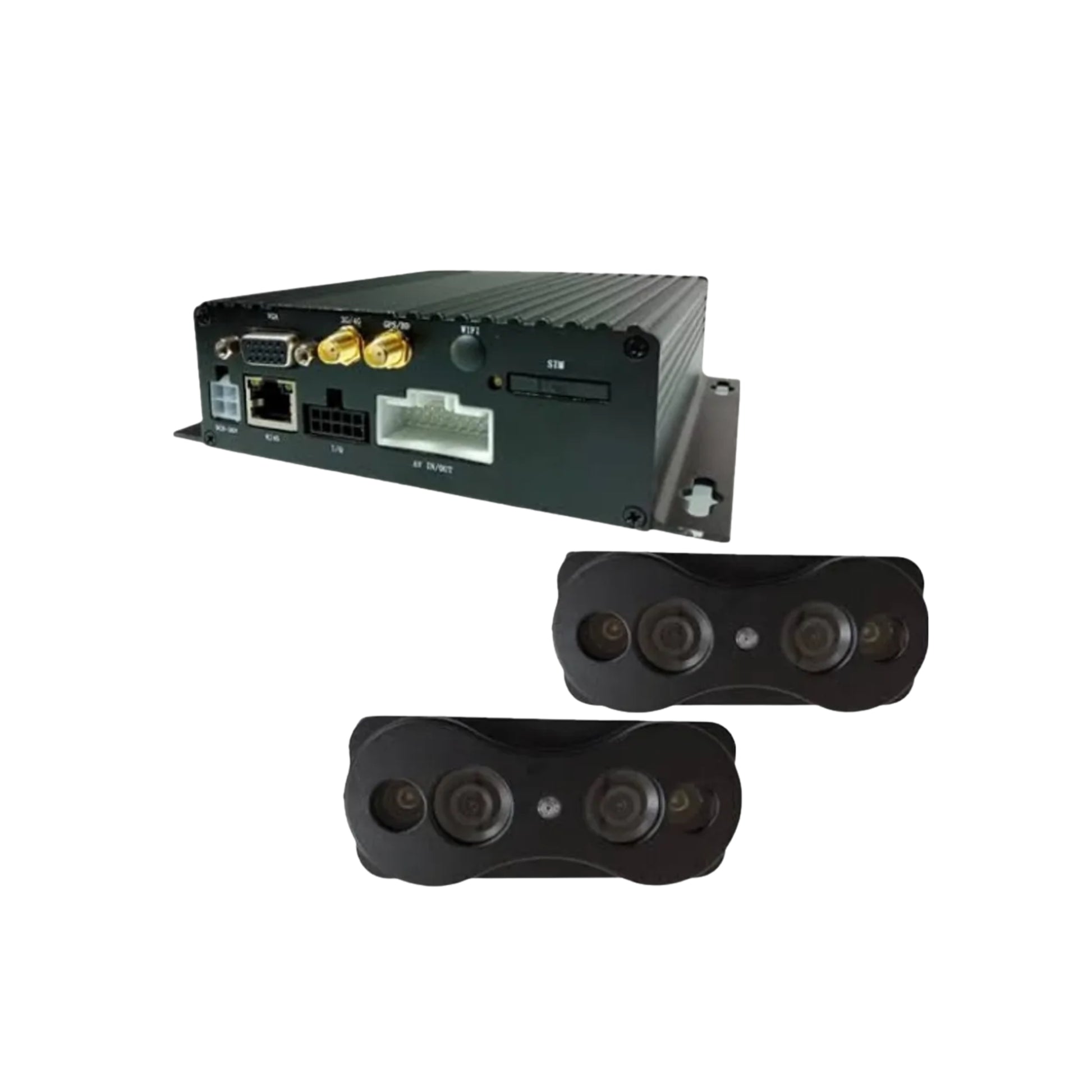 Kit MDVR profesional con 2 camaras contadoras de pasajeros de 4 canales AHD 1080 pixeles con GPS y conectividad remota vía Internet 4g la más rápida.